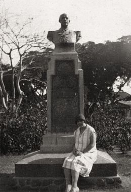 Zoals bij vele andere foto´s uit dit project: de maker van het plaatje is ons onbekend. Uit het album kan worden opgemaakt dat het een familie betrof die aan de Embong Kenongo heeft gewoond, op een steenworp afstand van de gouverneurswoning. We stellen ons zo voor dat de man des huizes met zijn vrouw en dochter naar het park voor de gouverneurswoning is gewandeld, en daar deze foto heeft gemaakt. De tekst van het monument – “opgedragen bij het jubileum van de Koningin Emmaschool” – helpt ons een reconstructie te maken van het doel en de bouw.