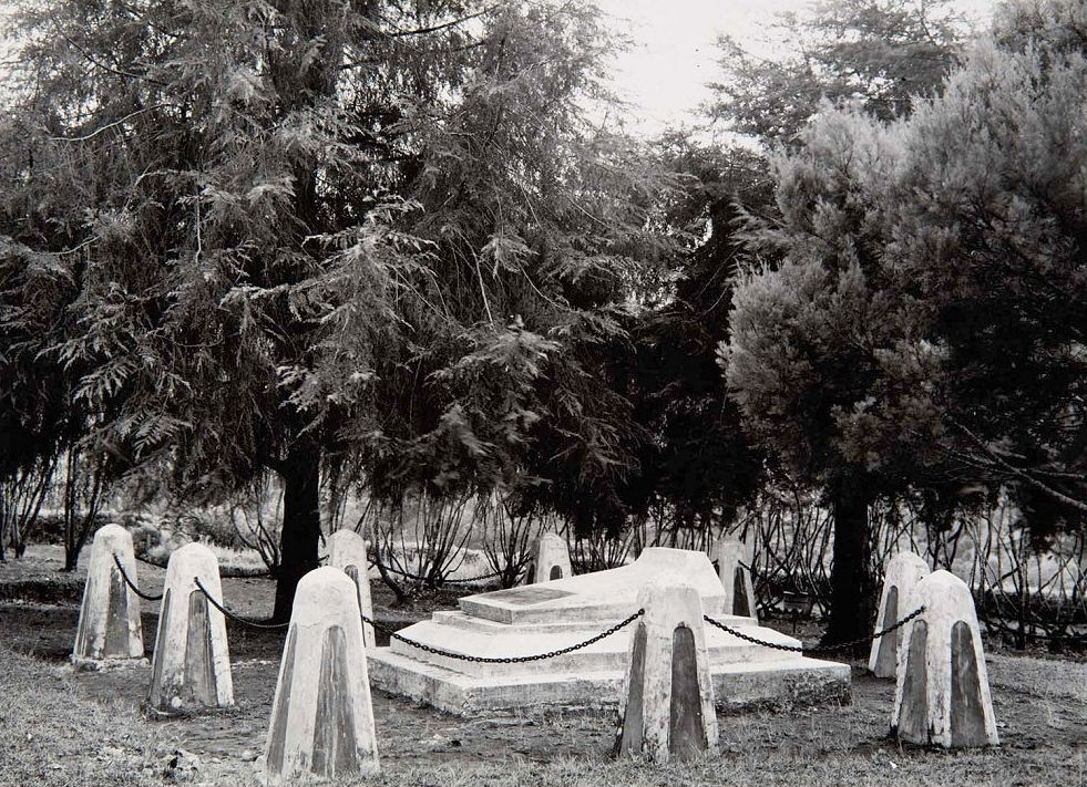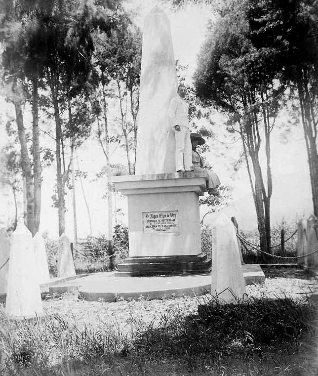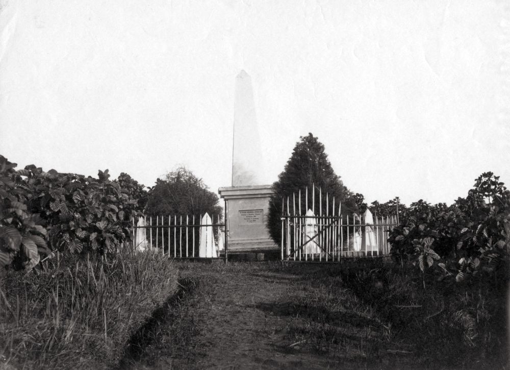 “Zijn jonge vrouw liet op zijn laatste rustplaats een gedenkzuil oprichten, die op gouvernementskosten wordt onderhouden. Er bestaan van dit grafmonument verschillende foto’s, die evenwel allen de huidige toestand onjuist weergeven. Op een dezer foto’s ziet men de gedenknaald, omringd door een plantsoen van hoge kinabomen, terwijl hardstenen palen ter lengte van ruim een meter, waartussen zware kettingen zijn gespannen, de toegang tot het monument afsluiten. Jammer genoeg zijn de kinabomen uitgeroeid en de hardstenen palen zijn vervangen door ijzeren staven, waartussen prikkeldraad is gespannen.”