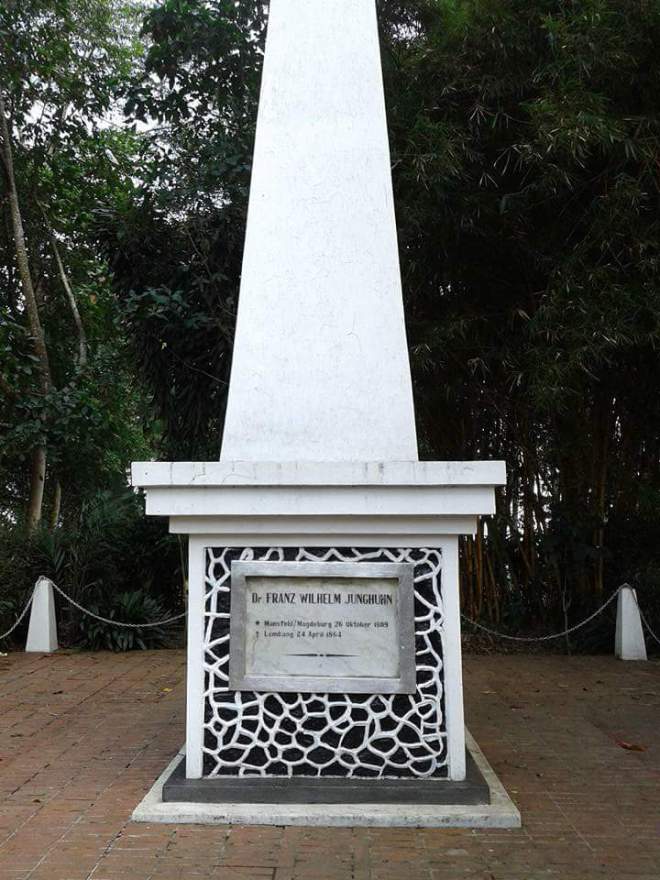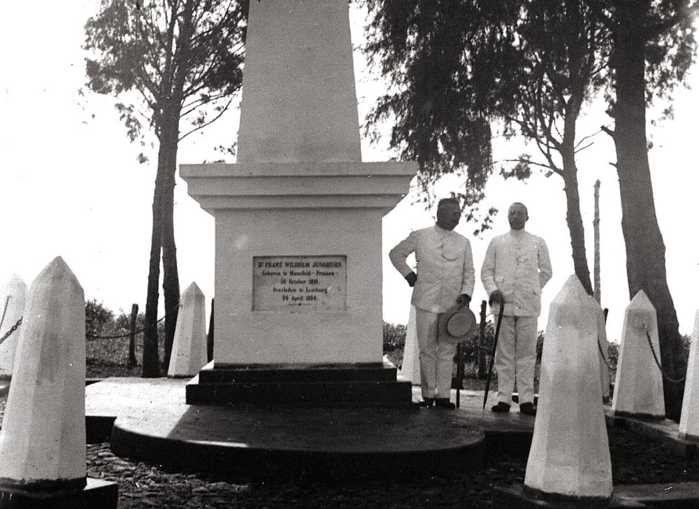 Lange tijd heeft de witte obelisk op het graf van Junghuhn gestaan, onder het groen van de tjemara- en kinabomen even ten Noorden van het bergplaatsje Lembang, doch de schennende hand des houthakkers heeft bij de restauratie die bomen niet gespaard. Thans ligt het graf kaal op de boomloze heuveltop. Deze obelisk werd op kosten van Mevrouw de Weduwe Junghuhn opgericht en eerst was het plan om aan de voorzijde daarvan een marmeren buste van den groten dode te plaatsen. Hiervoor waren tekeningen vervaardigd door Rochussen, een zwager van Junghuhn, doch de bekende fotograaf en artist van Kinsbergen maakte echter de tekeningen van den edele kop van Junghuhn zoek en zo is van het vervaardigen ener buste niets gekomen. Zeer waarschijnlijk is de marmeren plaat voor in de grafnaald eerst later aangebracht. Hierop staat te lezen: ´Dr. FRANZ WILHELM JUNGHUHN. geboren te Mansfeld-Pruisen. 26 October 1810 overleden te Lembang 24 April 1864.´