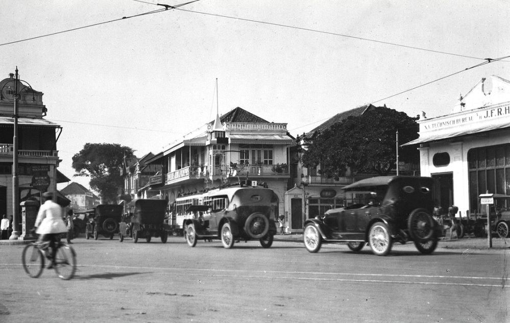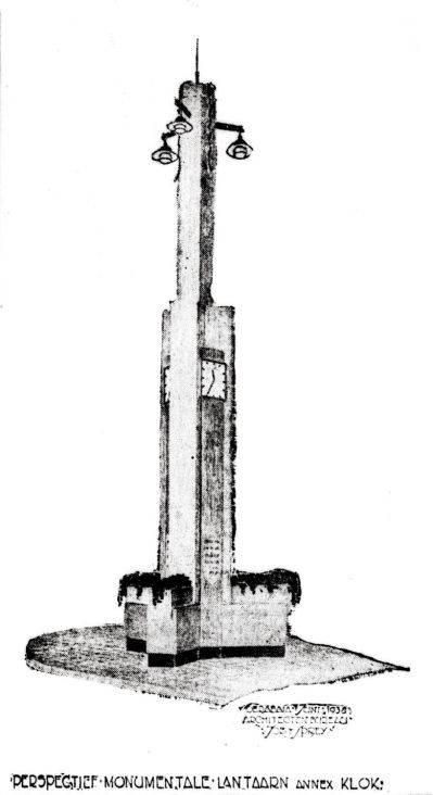 “Een bijzonder evenement zal worden gevormd door het aanbieden door de burgerij van een monumentaal souvenir aan het Gemeentebestuur, opdat de herinnering van de herdenking van dit regeringsjubileum zolang mogelijk in de gedachten der Soerabajanen zal blijven voortleven. Hiervoor is het Comité gekomen op de aanbieding van een monumentale lamp, geplaatst op een 9.3 Meter hoge zuil, welke zal worden opgericht in het centrum der stad, n.l. op het Simpangplein, waar de drie grootste verkeersaders onzer stad: Simpang, Toendjoengan en Kaliasin samenkomen. De heer Sprey, van de bekende architectenfirma Job en Sprey, was reeds zo voortvarend geweest een ontwerp hiervoor te maken, hetwelk gisteravond werd voorgelegd en een ieder’s grote bewondering had.