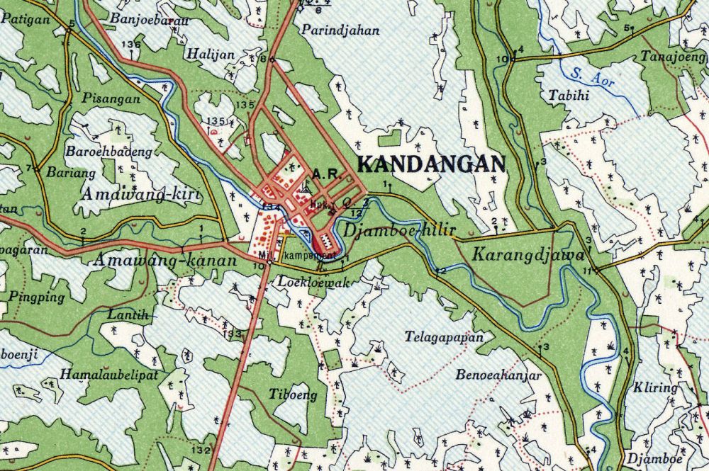 Kaart Kandangan. Het monument wordt hier aangeduid met een rood kruis, boven de tekst ‘militair kampement’