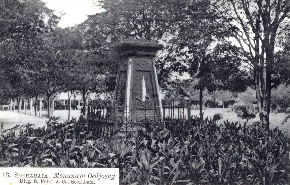 “Het monument verrezen — ter ere van den kommandant der zeemacht in 0ost-Indië destijds — aan de Oedjoeng (plaats der werf) te Soerabaja aanwezig, draagt (…) het opschrift ´Het corps zeeofficieren en de Ned. Indische handelstand ter nagedachtenis van Z. E. den vice-admiraal E. B. Van den Bosch´.”